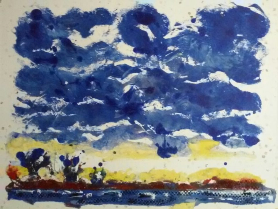 On a more playful note is this rather large and loose print made with Akua intaglio inks on confetti paper. There are often spectacular cloud formations and sunsets over this salt marsh, especially in fall and winter.